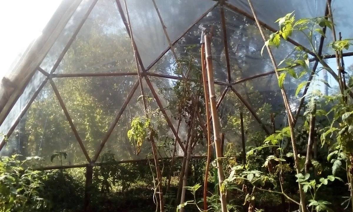 Instalada no terreno plano e levantada do chao 50 cm. por pilarcinhos de madeira rolhiça. Nesse espaço de 50cm o mosquiteiro preto fornece a ventilação deixando entrar o ar. O fluxo de entrada é controlado subindo o descendo a saia plastica de acordo a necessidade. O ar entrante circula dentro da estufa e sai pela abertura no topo, fornecendo uma circulação homogenea de ar.Os canteiros podem ser no nivel do solo o elevados 50cm do chao com estrutura de madeira o cimento. Os bambus no interior da estufa fornecen excelente suporte para guias de trepadeiras, canteiros, vasos pendurantes. Também tem espaço para bancadas de trabalho, pia e moveis para guardar ferramentas, adubos e sementes.